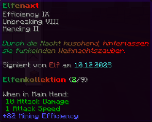 Eine süße, aber tödliche Axt, gebacken für die festlichsten Schlachten. Mit Effizienz VIII, Reparatur II und Haltbarkeit VIII verzaubert, kombiniert sie festlichen Charme mit unglaublicher Stärke.