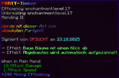 Diese Axt bringt den Partygeist direkt in den Wald! Mit Effizienz XVII, Haltbarkeit XVII und Reparatur II ist sie das ultimative Werkzeug für jeden Holzfäller. Jeder Schlag wird zum Hit – schnell, kraftvoll und unvergleichlich effektiv.