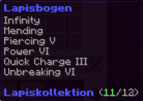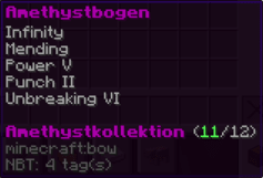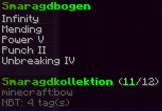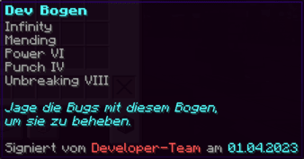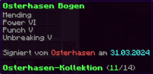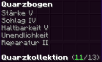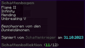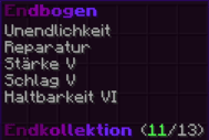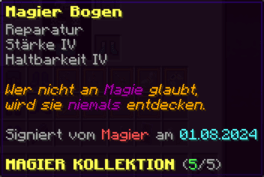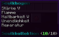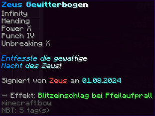 Ein Bogen von legendärer Macht, der Pfeile mit unendlicher Präzision verschießt. Verzaubert mit Unendlichkeit, Reparatur, Stärke V, Schlag V und Haltbarkeit VI, ist er die ultimative Fernkampfwaffe.