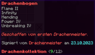 Ein majestätischer Bogen, geschaffen vom ersten Drachenmeister. Seine Pfeile brennen mit einer ewigen Flamme (Flamme) und kehren immer zu ihrem Besitzer zurück (Unendlichkeit). Er verspricht eine Kraft (Stärke) und Haltbarkeit (Haltbarkeit), die es dem Träger ermöglicht, Drachen in den Himmel zu zeichnen.