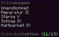 Ein legendärer Bogen, geschmiedet aus den härtesten Kohlefäden und mit einer unvergleichlichen Präzision ausgestattet. Verzaubert mit Unendlichkeit, Reparatur II, Stärke V, Schlag IV und Haltbarkeit IV, sorgt er für endlose Munition, maximale Durchschlagskraft und außergewöhnliche Haltbarkeit – ein unverzichtbares Werkzeug für jeden Schützen.