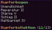 Ein präziser Bogen aus hochwertigem Kupfer, der Stärke und Beständigkeit vereint. Verzaubert mit Unendlichkeit, Reparatur II, Stärke V, Schlag II und Haltbarkeit IV, sorgt er für endlose Munition und maximale Durchschlagskraft – ein unverzichtbares Werkzeug für jeden Bogenschützen.