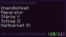Ein präziser Bogen aus Obsidian, der für seine immense Stärke und Zuverlässigkeit bekannt ist. Mit den Verzauberungen Unendlichkeit, Reparatur, Stärke V, Schlag II und Haltbarkeit IV bietet er endlose Munition und maximale Durchschlagskraft – ein unverzichtbares Werkzeug für jeden Schützen.