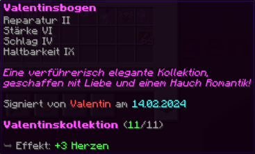 Ein Bogen, gesponnen aus den Sehnen der Romantik, bietet "Reparatur II" für endlose Hingabe, "Stärke IV" für kraftvolle Pfeile und "Schlag IV" für den wahren Liebestreffer. Ein Schmuckstück der Valentinskollektion, das Herzen schneller schlagen lässt.