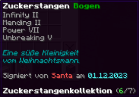 Ein Bogen so süß und festlich, dass er direkt aus der Werkstatt des Weihnachtsmanns zu kommen scheint. Er verschießt unendliche (Unendlichkeit) Pfeile, die sich selbst heilen (Reparatur), und sein Zug (Stärke) ist so kräftig wie der winterliche Nordwind. Mit ihm kann jeder Tag ein Fest der Freude sein.