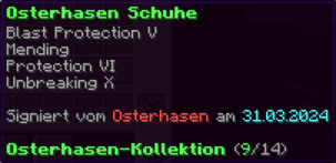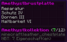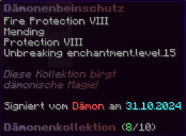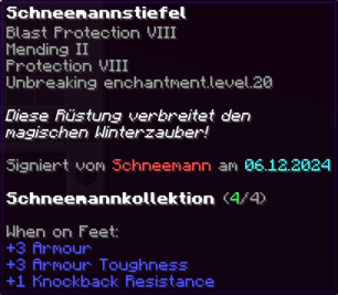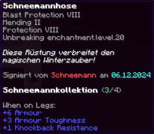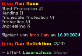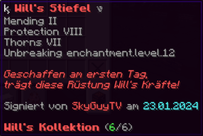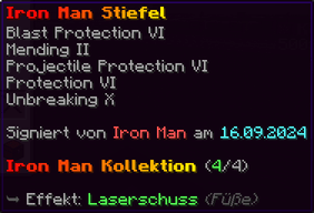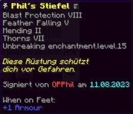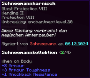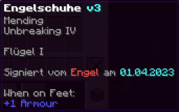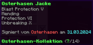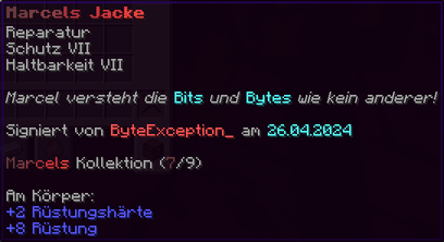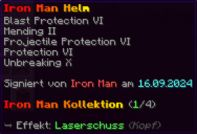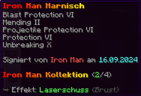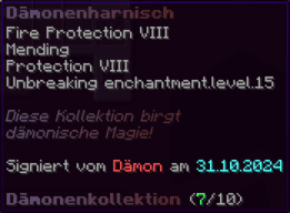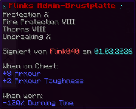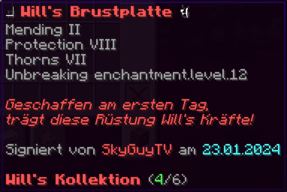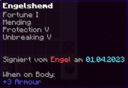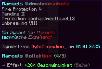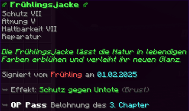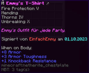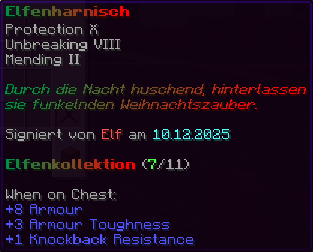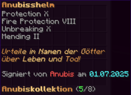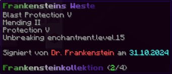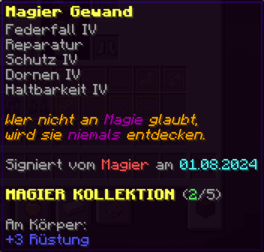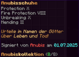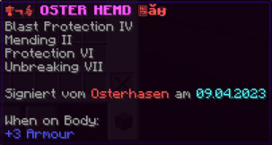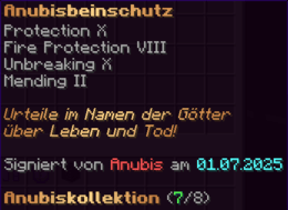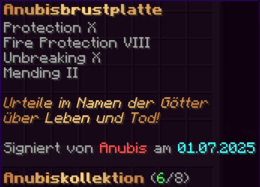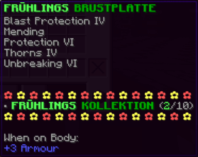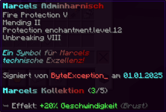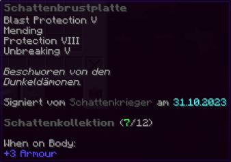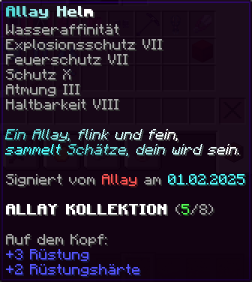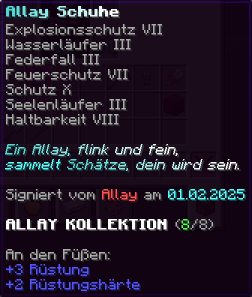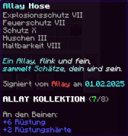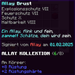 Eine Rüstung, leicht wie die Flügel eines Allay, doch stark genug, um jeden Angriff zu überstehen. Verzaubert mit Explosionsschutz VII, Feuerschutz VII, Schutz X und Haltbarkeit VIII, sorgt sie für maximale Verteidigung.