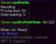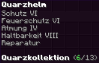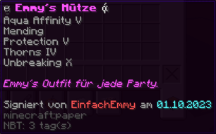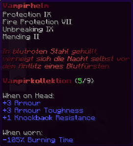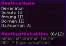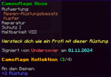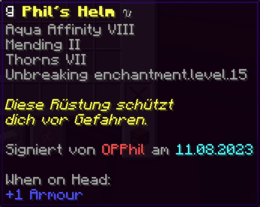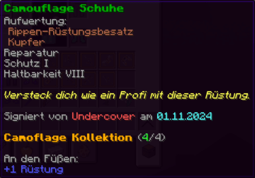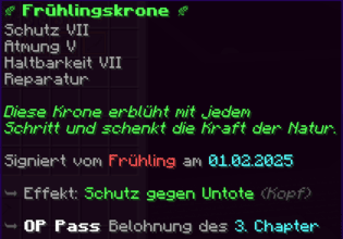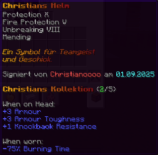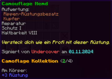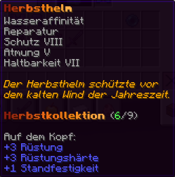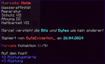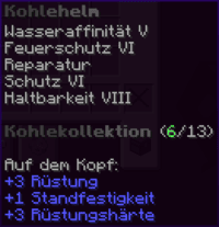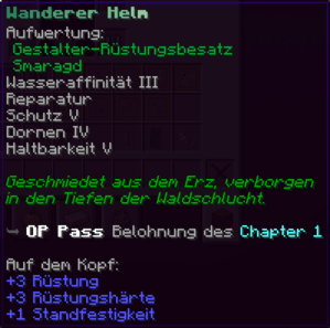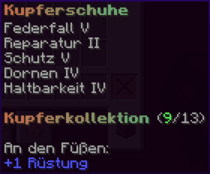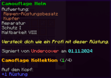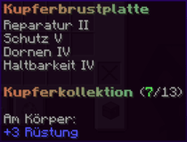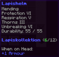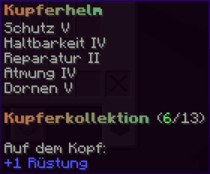 Ein prächtiger Helm aus hochwertigem Kupfer, der den Kopf seines Trägers vor allen Gefahren schützt. Mit Schutz V, Haltbarkeit IV, Reparatur II, Atmung IV und Dornen V verzaubert, gewährleistet er nicht nur optimalen Schutz, sondern auch die Fähigkeit, unter Wasser länger zu überleben.
