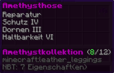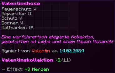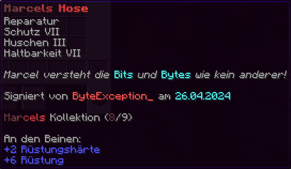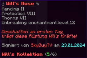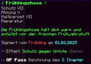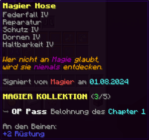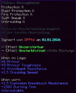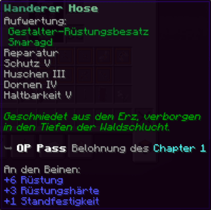 Eine Hose, die mit "Feuerschutz IV" und "Reparatur II" sicher durch jedes Abenteuer führt. "Dornen V" wehrt alle Widrigkeiten ab, und "Haltbarkeit IX" verspricht, dass sie fast so lange halten wird wie die ewige Zuneigung.