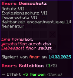 Ein göttlicher Beinschutz, erschaffen durch Amor selbst, verleiht seinem Träger außergewöhnlichen Schutz. Mit Schutz VII, Explosionsschutz VII und Feuerschutz VII ist der Träger bestens gegen Angriffe gewappnet. Haltbarkeit XIV macht ihn nahezu unzerstörbar, und durch Reparatur bleibt er stets in perfektem Zustand.