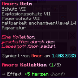 Ein von Amor selbst gesegneter Helm, der seinen Träger mit göttlichem Schutz umhüllt. Schutz VII bietet maximalen Schutz vor Angriffen, während Explosionsschutz VII und Feuerschutz VII zusätzliche Sicherheit garantieren. Haltbarkeit XIV macht ihn nahezu unzerstörbar, und mit Reparatur bleibt er dauerhaft einsatzbereit.