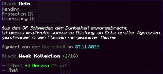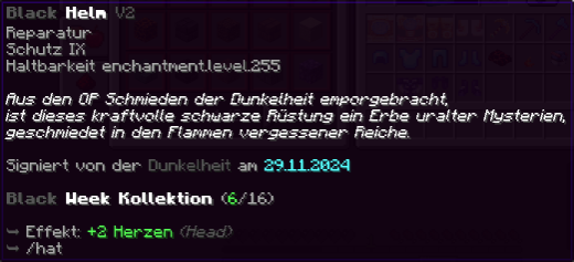 Ein Helm aus der Finsternis der Schmieden alter Reiche. Verzaubert mit Reparatur, Schutz IX und Haltbarkeit 255, verleiht er seinem Träger unvergleichliche Widerstandsfähigkeit. Das perfekte Artefakt für jene, die im Schatten herrschen.