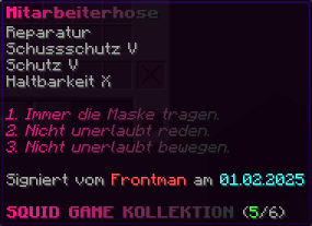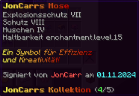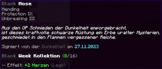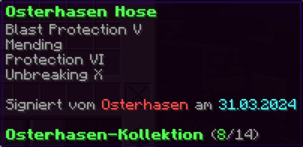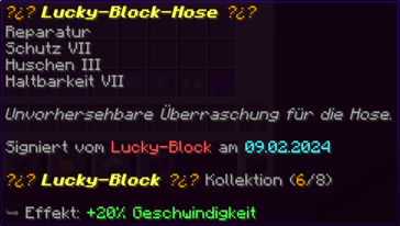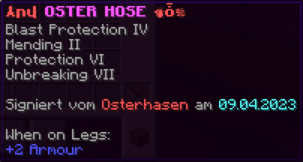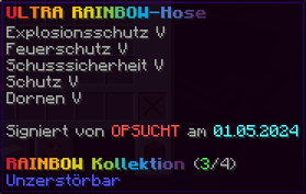 Die OP-Luckyblock Hose bietet ultimativen Schutz für deine Beine. Mit Feuerschutz V bleibst du vor Flammen sicher, und Schutz V sowie Dornen III bieten maximalen Schutz vor Angriffen. Jeder Luckyblock birgt eine unerwartete Überraschung für deine Sammlung! Signiert von OPSUCHT, ist diese Hose unzerstörbar und ein unverzichtbarer Teil deiner Rüstung.
