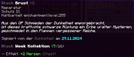 Eine Rüstung, geschmiedet in den dunklen Schmieden vergessener Reiche. Mit Reparatur, Schutz IX und Haltbarkeit 255 verzaubert, bietet sie ultimativen Schutz gegen jede Bedrohung. Ein Vermächtnis der Schatten, geschaffen für jene, die keine Angst vor der Dunkelheit haben.
