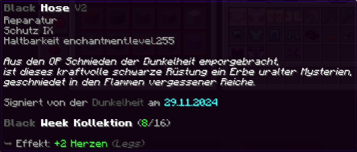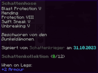 Diese Hose trägt die Macht der Dunkelheit in sich. Mit Reparatur, Schutz IX und Haltbarkeit 255 verzaubert, gewährt sie ihrem Träger unübertroffenen Schutz und Stärke, selbst in den gefährlichsten Schlachten.