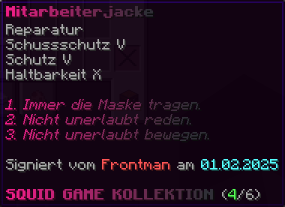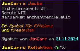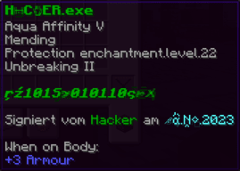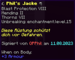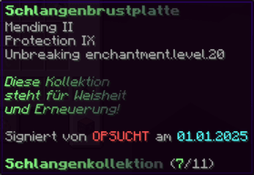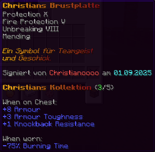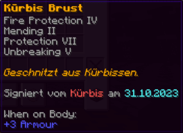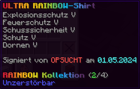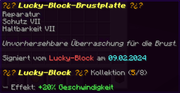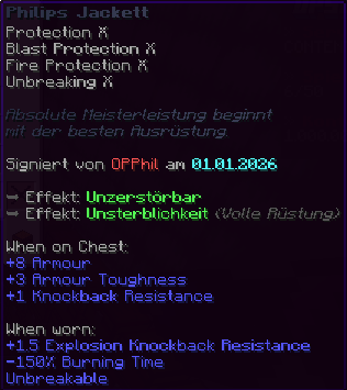 Die OP-Luckyblock Brustplatte bietet ultimativen Schutz. Mit Feuerschutz V bleibst du vor Flammen sicher, und Schutz V sowie Dornen III bieten maximalen Schutz vor Angriffen. Jeder Luckyblock birgt eine unerwartete Überraschung für deine Sammlung! Signiert von OPSUCHT, ist diese Brustplatte unzerstörbar und ein unverzichtbarer Teil deiner Rüstung.