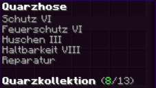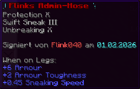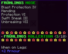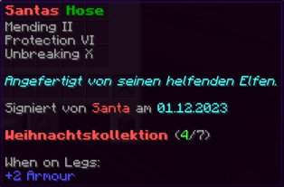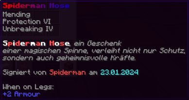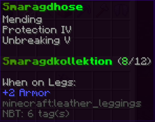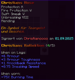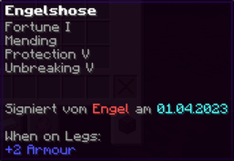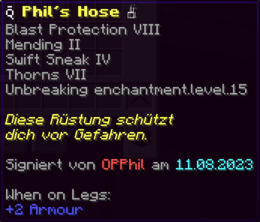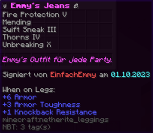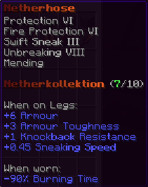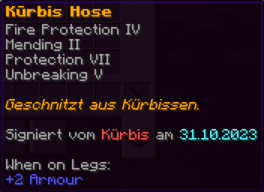 Diese Hosen sind so robust wie die Rüstung eines Ritters und so bequem wie ein Wolkenbett. Mit Feuerschutz V, Reparatur und der Schnelligkeit eines flinken Fuchses bist du bereit für jedes Abenteuer.