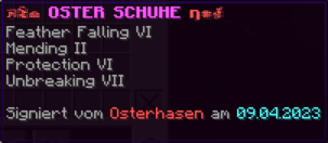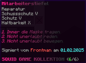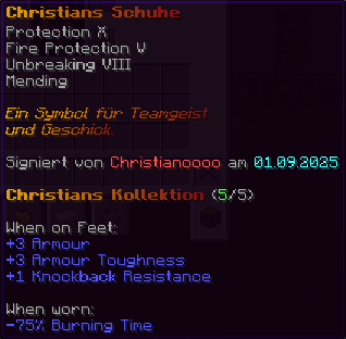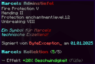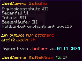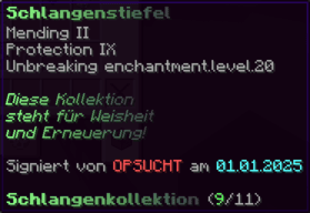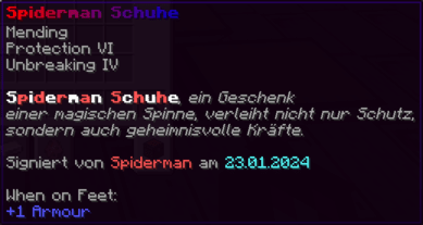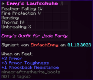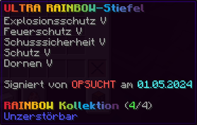 Die OP-Luckyblock Schuhe bieten ultimativen Schutz für deine Füße. Mit Feuerschutz V bleibst du vor Flammen sicher, und Schutz V sowie Dornen III bieten maximalen Schutz vor Angriffen. Jeder Luckyblock birgt eine unerwartete Überraschung für deine Sammlung! Signiert von OPSUCHT, sind diese Schuhe unzerstörbar und ein unverzichtbarer Teil deiner Rüstung.