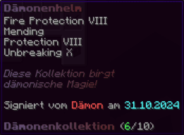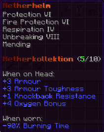 Ein Helm, geschmiedet in den Tiefen der Hölle, der ultimativen Schutz bietet. Er ist verzaubert mit Feuerschutz VIII, Reparatur, Schutz VIII und Haltbarkeit X.