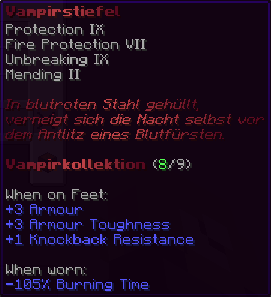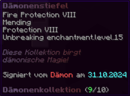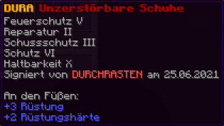 Diese Stiefel sind mit dämonischer Magie erfüllt und bieten ihrem Träger ultimativen Schutz. Sie sind verzaubert mit Feuerschutz VIII, Reparatur, Schutz VIII und Haltbarkeit XV.