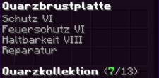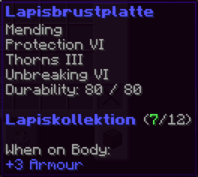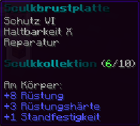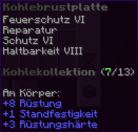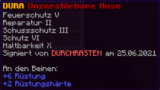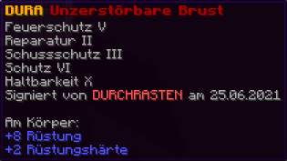 Eine Brustplatte, die für absolute Unverwüstlichkeit steht. Mit Feuerschutz V, Reparatur II, Schussschutz III, Schutz VI, Haltbarkeit X verzaubert, ist sie ein Bollwerk gegen alle Angriffe.