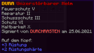 Ein Helm von legendärer Widerstandskraft. Mit Feuerschutz V, Reparatur II, Schussschutz III, Schutz VI, Haltbarkeit X verzaubert, trotzt er jeder Gefahr.