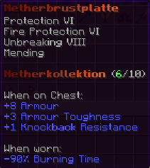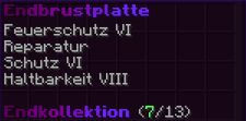 Eine Brustplatte, geschaffen aus der Essenz des Endes. Sie ist mit Feuerschutz VI, Reparatur, Schutz VI und Haltbarkeit VIII verzaubert und bietet unermüdlichen Schutz in den gefährlichsten Gefilden.