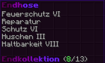 Eine Hose, die niemals nachgibt. Mit Feuerschutz V, Reparatur II, Schussschutz III, Schutz VI, Haltbarkeit X verzaubert, macht sie den Träger nahezu unbesiegbar.