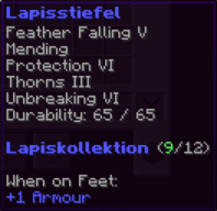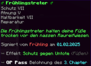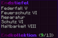 Diese Stiefel bieten ultimativen Schutz in den Tiefen des Endes. Mit Federfall V, Feuerschutz VI, Reparatur, Schutz VI und Haltbarkeit VIII verzaubert, sorgen sie für sanfte Landungen und unerschütterliche Verteidigung.