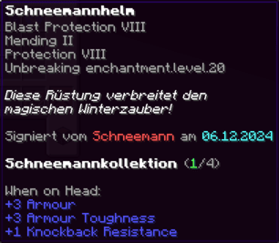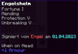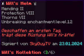 Ein Helm von unvergleichlicher Macht, geschmiedet aus purem Glück und unerschütterlicher Stärke. Mit Reparatur II, Schutz VIII, Atmung III, Dornen IV und Haltbarkeit VI verzaubert, bietet er nicht nur exzellenten Schutz, sondern auch die Fähigkeit, unter Wasser länger zu überleben – eine Kopfbedeckung für wahre Glücksritter.