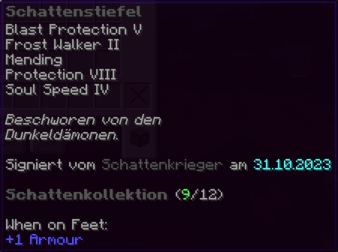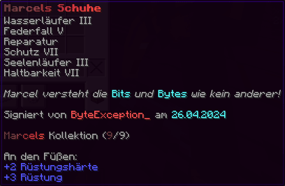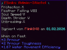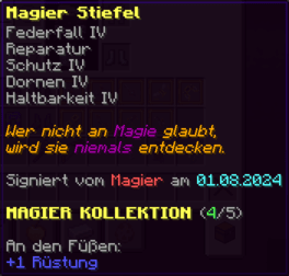 Schritte, die Chaos hinterlassen – und niemals stoppen. Diese Stiefel sind mit Projektilschutz X, Schutz X, Reparatur II und Haltbarkeit IX verzaubert.