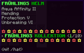 Ein Helm so mutig wie die Drachenjäger, die durch den Himmel reisen. Mit Reparatur, Schutz IV und Atmung III kannst du tiefe Gewässer erforschen, ohne nach Luft schnappen zu müssen. Die Dornen III lassen Gegner zweimal nachdenken, bevor sie dich angreifen!