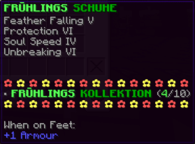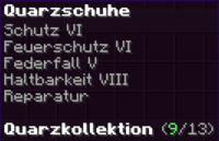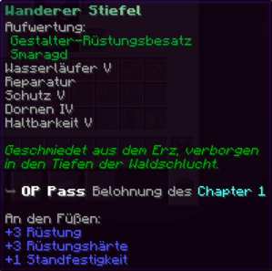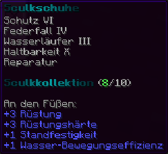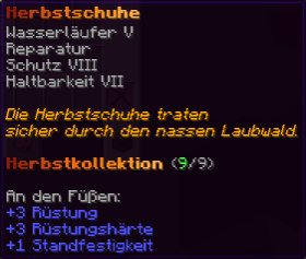 Schutz VI bietet zuverlässigen Schutz für deine Füße, während Federfall IV den Fallschaden reduziert. Wasserläufer III erhöht die Effizienz im Wasser, unterstützt von Haltbarkeit X und Reparatur.