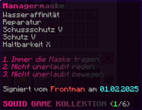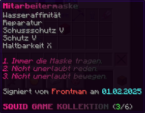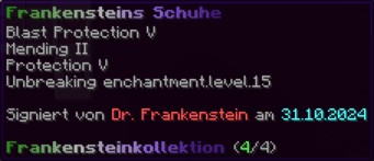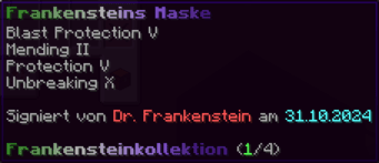 Eine unheimliche Maske aus der Frankenstein-Kollektion. Verzaubert mit Explosionsschutz V, Reparatur II, Schutz V und Haltbarkeit X.
