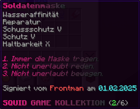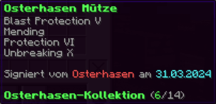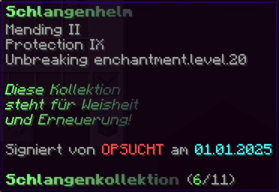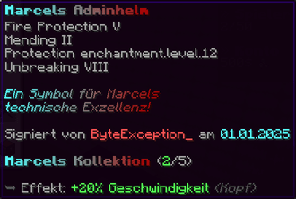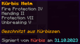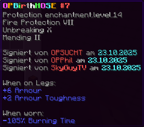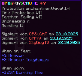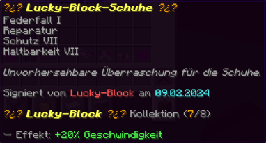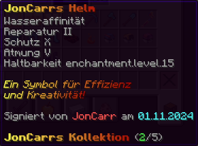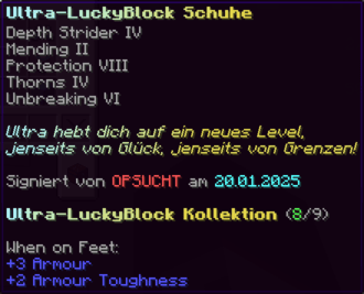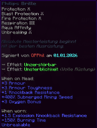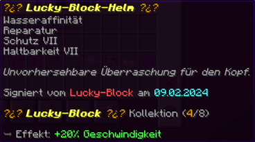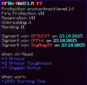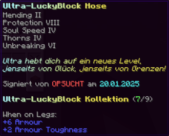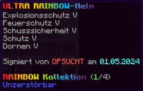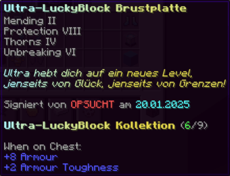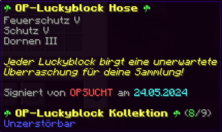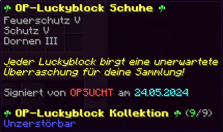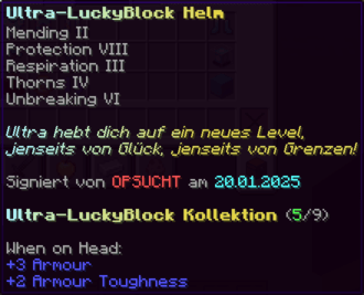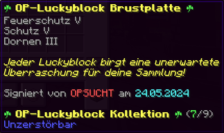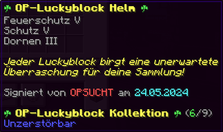 Der OP-Luckyblock Helm bietet ultimativen Schutz für deinen Kopf. Mit Feuerschutz V bleibst du vor Flammen sicher, und Schutz V sowie Dornen III bieten maximalen Schutz vor Angriffen. Jeder Luckyblock birgt eine unerwartete Überraschung für deine Sammlung! Signiert von OPSUCHT, ist dieser Helm unzerstörbar und ein unverzichtbarer Teil deiner Rüstung.