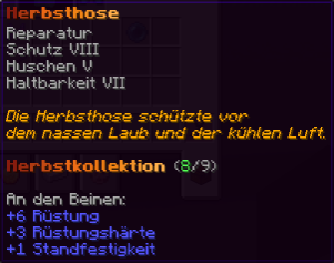 Ein Panzer aus der Essenz des Herbstes. Reparatur, Schutz VIII und Haltbarkeit VII machen diesen Harnisch zu einem zuverlässigen Begleiter.