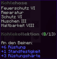 Diese robuste Hose ist ein Meisterwerk der Kohleschmiede und ein Symbol für Stärke und Schutz. Sie ist mit Feuerschutz VI, Reparatur, Schutz VI, Huschen III und Haltbarkeit VIII verzaubert, wodurch sie nicht nur vor den härtesten Angriffen schützt, sondern auch eine erhöhte Beweglichkeit ermöglicht..