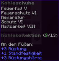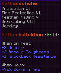 Diese schweren Stiefel, gehärtet in der Glut des Netherfeuers, bieten mit Federfall V, Schutz VI, Haltbarkeit VIII, Reparatur II und Feuerschutz VI ein stabiles Fundament – selbst auf unsicherem Terrain.