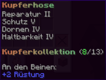 Diese sorgfältig geschmiedete Hose aus Kupfer kombiniert Beweglichkeit und Verteidigung. Sie ist mit Reparatur II, Schutz V, Dornen IV und Haltbarkeit IV verzaubert und bietet einen unvergleichlichen Schutz vor feindlichen Angriffen..
