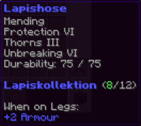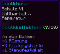 Eine Hose, die den Träger mit Geschwindigkeit und Schutz segnet. Verzaubert mit Reparatur II, Schutz VIII, Seelentempo IV, Dornen IV und Haltbarkeit VI, verleiht sie außergewöhnliche Widerstandskraft und ermöglicht eine blitzschnelle Fortbewegung – das perfekte Rüstungsteil für abenteuerlustige Kämpfer.