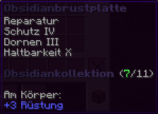 Die Obsidianbrustplatte bietet ultimativen Schutz. Mit Reparatur und Schutz IV bleibst du sicher, und Dornen III schaden jedem, der dich angreift. Haltbarkeit X macht sie nahezu unzerstörbar. Am Körper bietet sie +3 Rüstung. Ein mächtiges Stück der Obsidiankollektion.