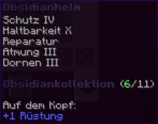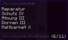Ein majestätischer Helm, gefertigt aus purem Obsidian, der Schutz und Langlebigkeit in Perfektion kombiniert. Mit Schutz IV, Haltbarkeit X, Reparatur, Atmung III und Dornen III verzaubert, bietet er überragenden Schutz, außergewöhnliche Beständigkeit und die Fähigkeit, länger unter Wasser zu atmen.