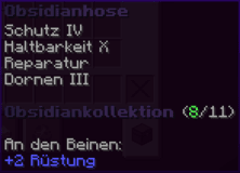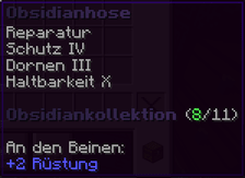 Die Obsidianhose bietet ultimativen Schutz für deine Beine. Mit Reparatur und Schutz IV bleibst du sicher, und Dornen III schaden jedem, der dich angreift. Haltbarkeit X macht sie nahezu unzerstörbar. An den Beinen bietet sie +2 Rüstung. Ein mächtiges Stück der Obsidiankollektion.