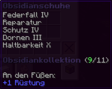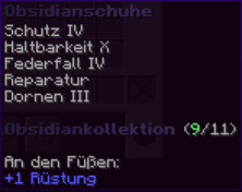 Die Obsidianschuhe sind ein Teil der beeindruckenden Obsidiankollektion. Mit Federfall IV landest du immer sanft, und Reparatur hält die Schuhe in Topform. Schutz IV und Dornen III bieten maximalen Schutz vor Angriffen, während Haltbarkeit X die Schuhe nahezu unzerstörbar macht. An den Füßen bieten sie +1 Rüstung. Perfekt für jedes Abenteuer, das auf dich wartet!