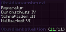 ine beeindruckende Armbrust aus dem härtesten Obsidian, die durch ihre Durchschlagskraft und Präzision besticht. Verzaubert mit Reparatur, Durchschuss IV, Schnellladen III und Haltbarkeit VI, bietet sie außergewöhnliche Feuerrate, Langlebigkeit und Zuverlässigkeit – ein wahres Meisterwerk der Schmiedekunst.