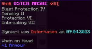 Diese Maske, signiert vom Osterhasen, bringt festliche Freude mit jedem getragenen Augenblick. Mit Schutz vor lauten Knallen und einer selbstheilenden Magie ist sie die perfekte Verkleidung für jede Osterfeier.