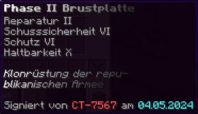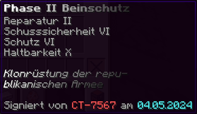 Die Phase II Brustplatte bietet ultimativen Schutz für jeden Soldaten der republikanischen Armee. Reparatur II und Schusssicherheit VI sorgen dafür, dass du sicher bleibst. Schutz VI und Haltbarkeit X machen sie langlebig und zuverlässig. Signiert von CT-7567, ist diese Rüstung ein wahres Meisterwerk.