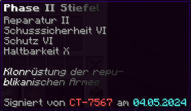Der Phase II Helm schützt deinen Kopf vor allen Gefahren. Mit Reparatur II und Schusssicherheit VI bleibt er immer in Topform. Schutz VI und Haltbarkeit X machen ihn unzerstörbar. Ein unverzichtbarer Bestandteil der Klonrüstung der republikanischen Armee, signiert von CT-7567.