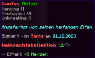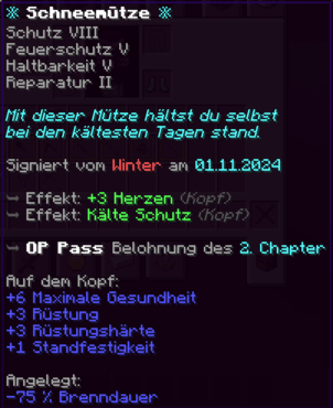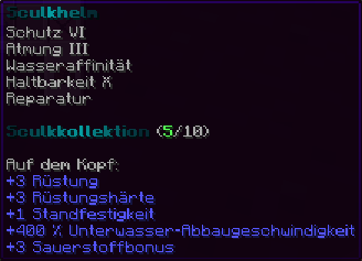 Eine Mütze so magisch, dass sie dich sogar unter Wasser atmen lässt. Mit Unterwasseratmung V schwimmst du schneller als ein Fisch. Reparatur und Schutz V halten dich sicher, egal wohin dein Abenteuer dich führt.