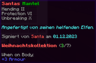 Dieser Mantel, gewoben aus der Essenz des Weihnachtswunders, bietet unvergleichlichen Schutz. Mit Reparatur gewappnet, hält er nicht nur den Körper, sondern auch die Freude am Fest unversehrt.