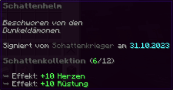 Der Schattenhelm ist eine imposante Präsenz, die den Träger mit zusätzlichen Herzen und Rüstung umgibt. Er ist das ultimative Zeichen des nächtlichen Kriegers, der im Verborgenen wandelt.